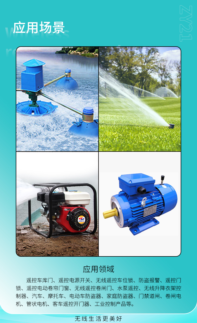 遥控开关、防盗报警、遥控门锁、遥控电动卷帘门窗、水泵遥控、工业控制产品等;